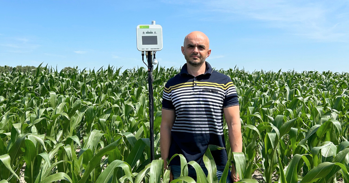 Photo: e-kakashi installed in a corn field, with Associate Professor Patsula of Ivan Franko National University of Lviv